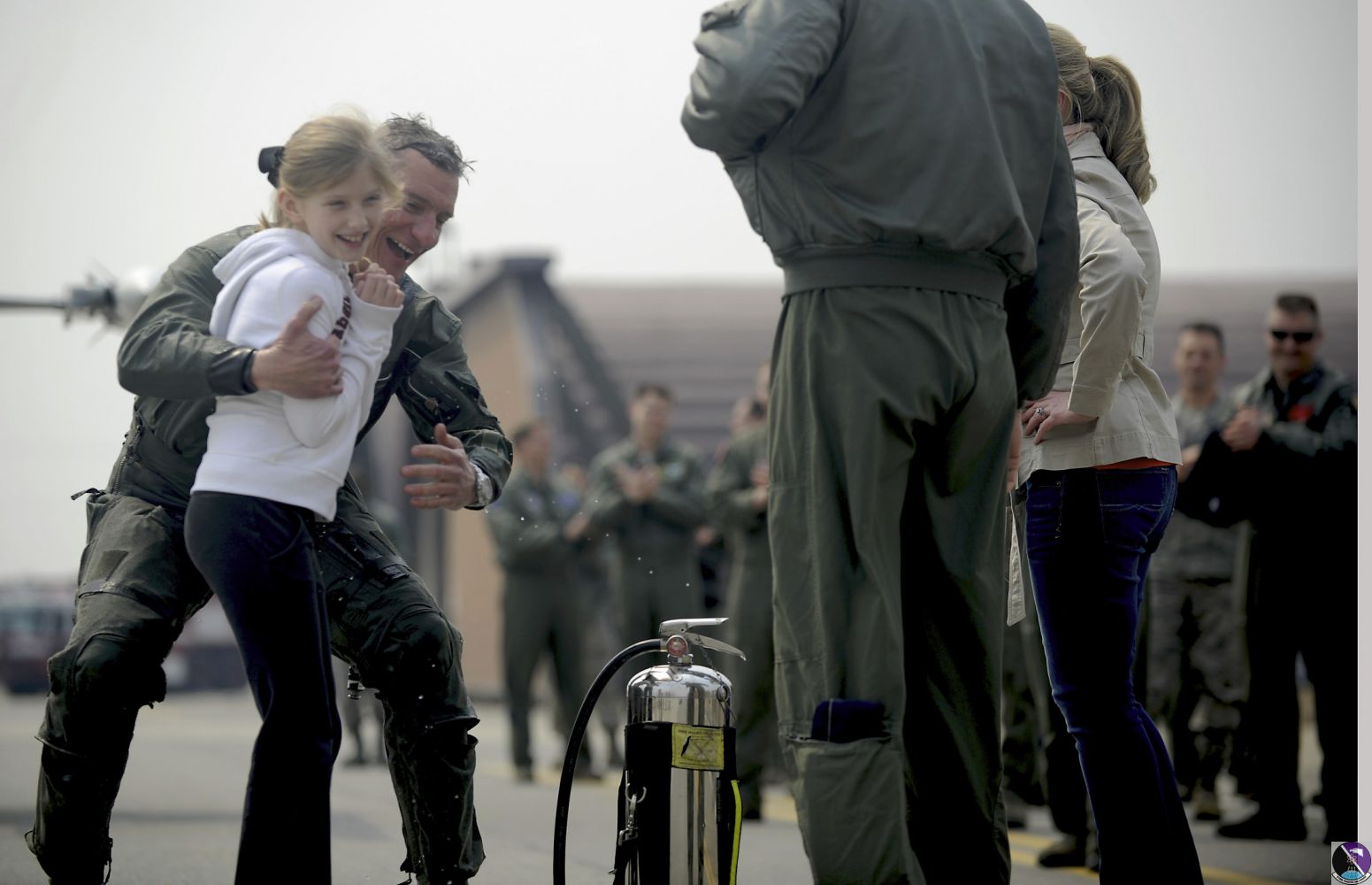• Col. Patrick McKenzie, 51st Fighter Wing commander, hugs his daughter after reaching 3,000 flying hours in an F-16 Fighting Falcon at Osan Air Base, Republic of Korea, March 28, 2013. Only a little more than 200 F-16 pilots worldwide are documented as sharing this 3,000-hour achievement. (U.S. Air Force photo/Staff Sgt. Sara Csurilla)