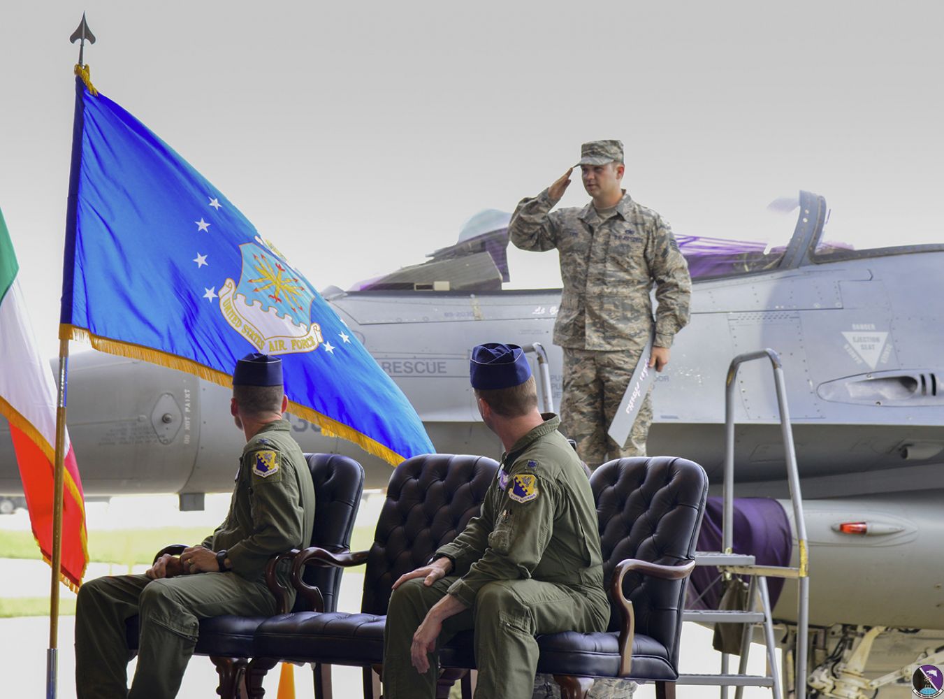 • Italian air force Col. Vincenzo Tozzi, Aviano base commander, greets friends and family after exiting an F-16 Fighting Falcon at Aviano Air Base, Italy, Sept. 17, 2019. Col. Tozzi was given a flight in an F-16 as a show of gratitude from the 31st Fighter Wing for his time as base commander. (U.S. Air Force photo by Staff Sgt. Kelsey Tucker)