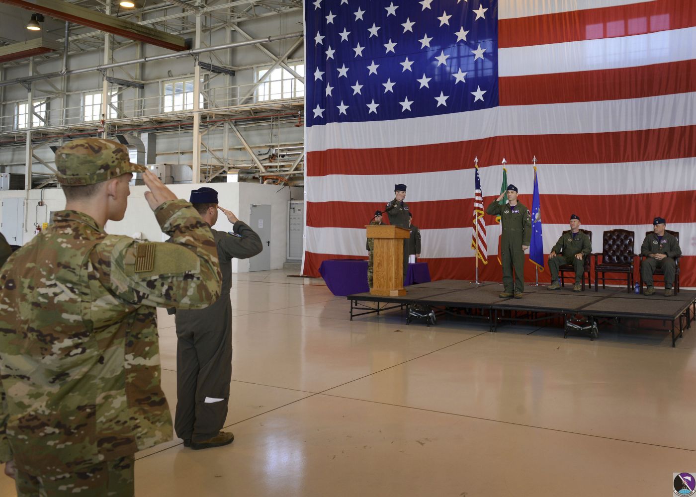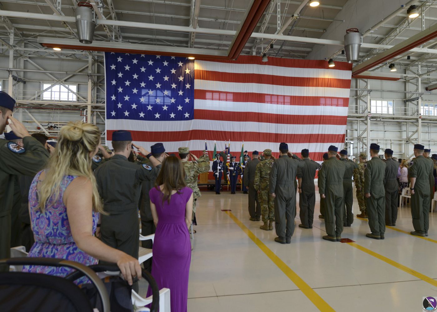 • Civilian and military participants stand for the U.S. and Italian national anthems during the 510th change of command ceremony at Aviano Air Base, Italy, June 21, 2019. Military ceremonies typically begin with the national anthem and an invocation by a chaplain. (U.S. Air Force photo by Staff Sgt. Rebeccah Woodrow)