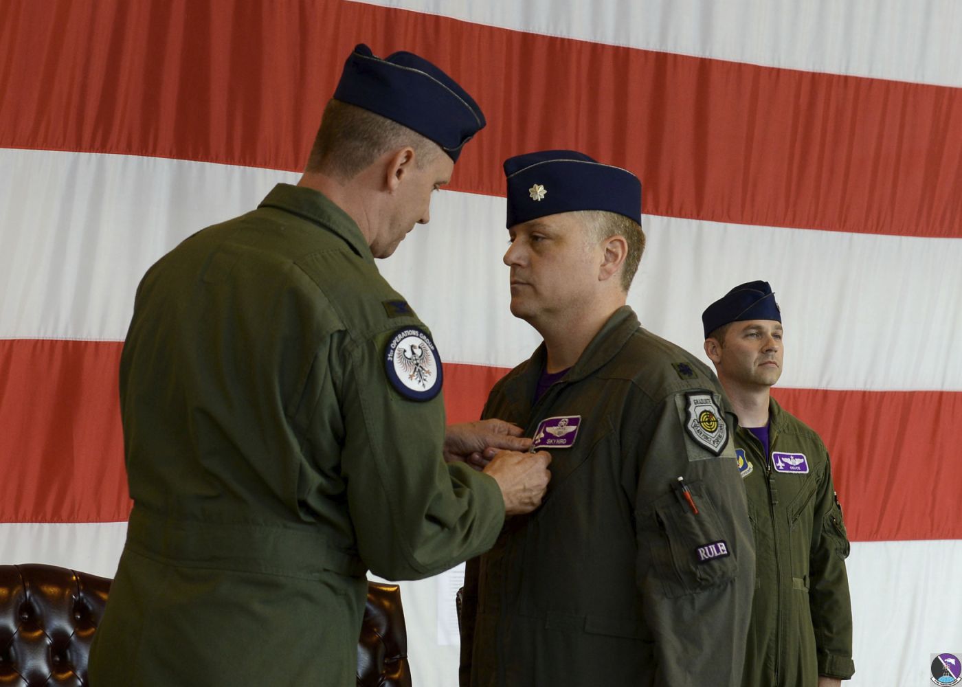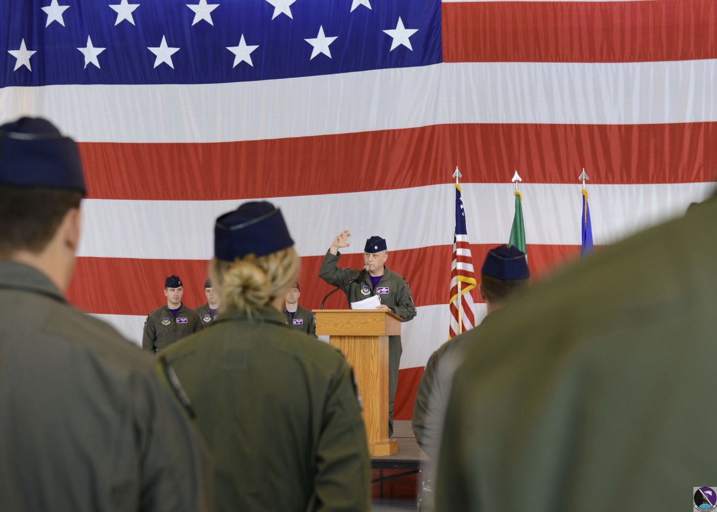 • U.S. Air Force Lt. Col. Benjamin S. Freeborn, outgoing commander of the 510th Fighter Squadron, displays the "Buzzards" hand signal during the 510th FS change of command ceremony at Aviano Air Base, Italy, June 21, 2019. The 510th FS, also known as the "Buzzards", plays a crucial role in the most diverse combat-ready fighter wing. (U.S. Air Force photo by Staff Sgt. Rebeccah Woodrow)