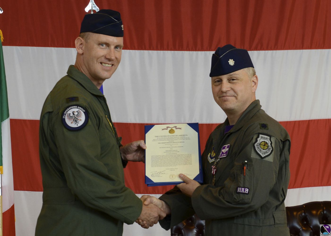 • U.S. Air Force Lt. Col. Richard J. Nelson, commander of the 31st Operations Group, passes on a guidon to Lt. Col. Daniel R. Lindsey, incoming commander of the 510th Fighter Squadron, during a change of command ceremony at Aviano Air Base, Italy, June 21, 2019. The exchange of the guidon represents a change in command position. (U.S. Air Force photo by Staff Sgt. Rebeccah Woodrow)