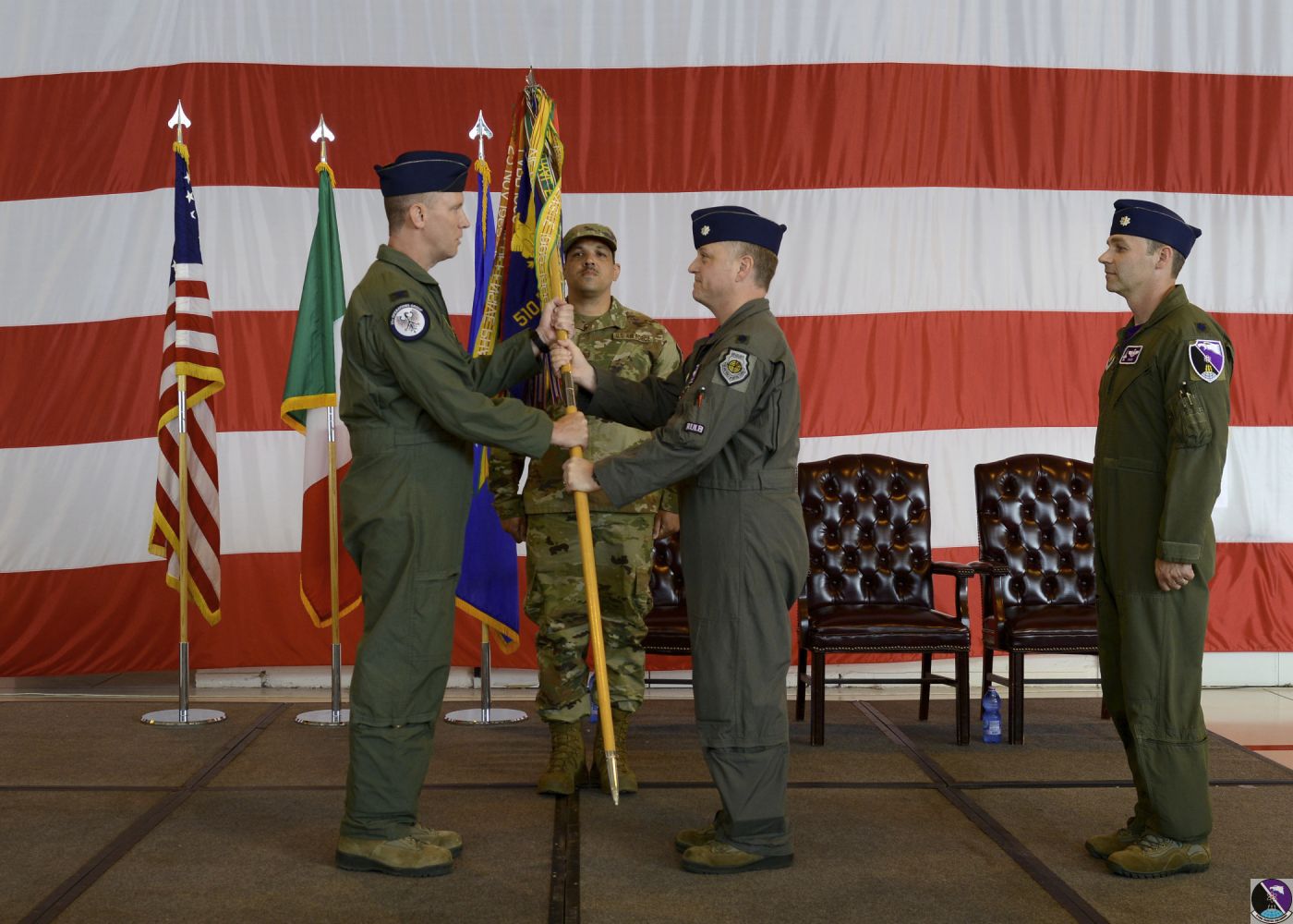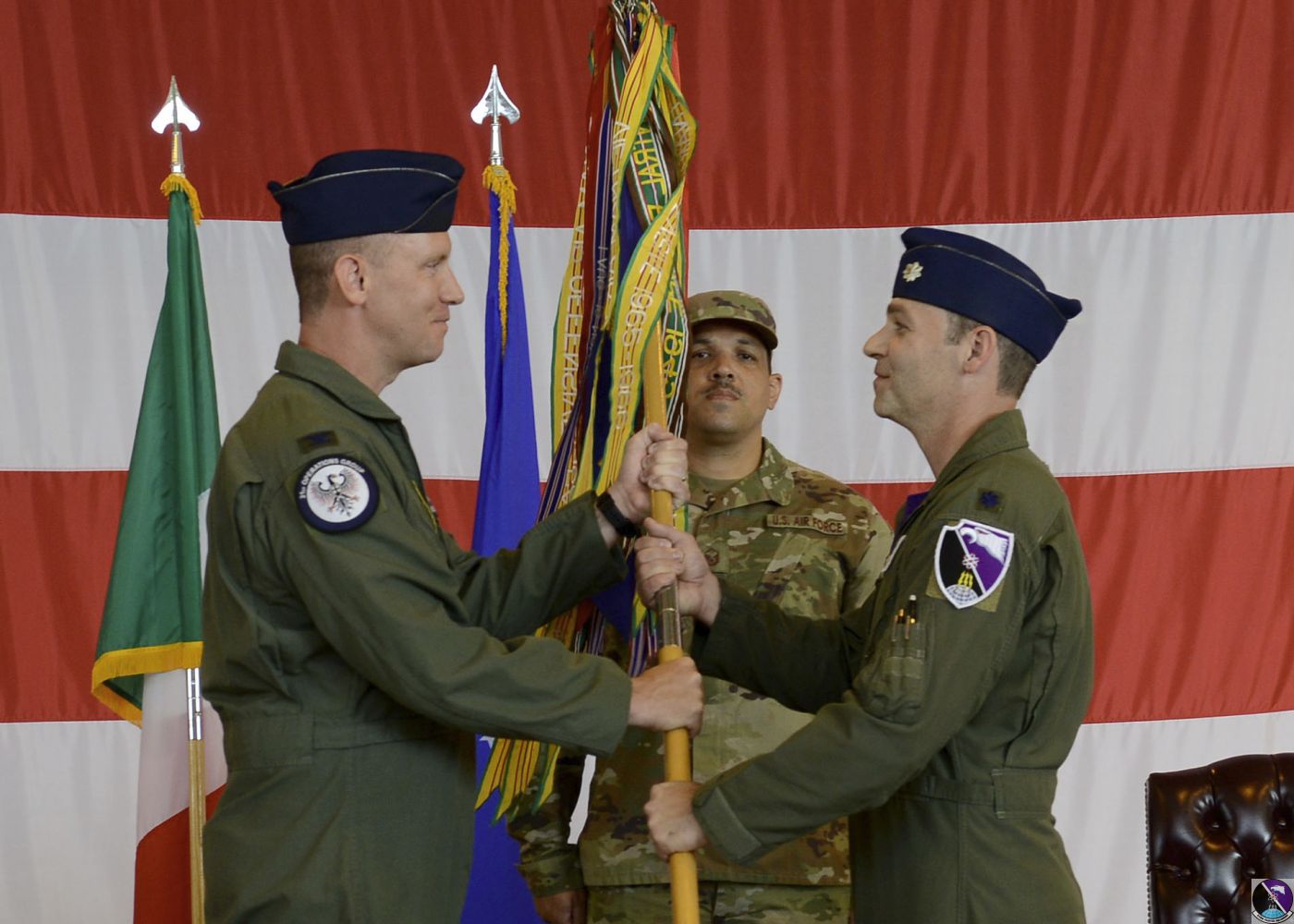 • U.S. Air Force Lt. Col. Richard J. Nelson, commander of the 31st Operations Group, takes back a guidon from Lt. Col. Benjamin S. Freeborn, outgoing commander of the 510th Fighter Squadron, during a change of command ceremony at Aviano Air Base, Italy, June 21, 2019. The exchange of the guidon represents a change in command position. (U.S. Air Force photo by Staff Sgt. Rebeccah Woodrow)