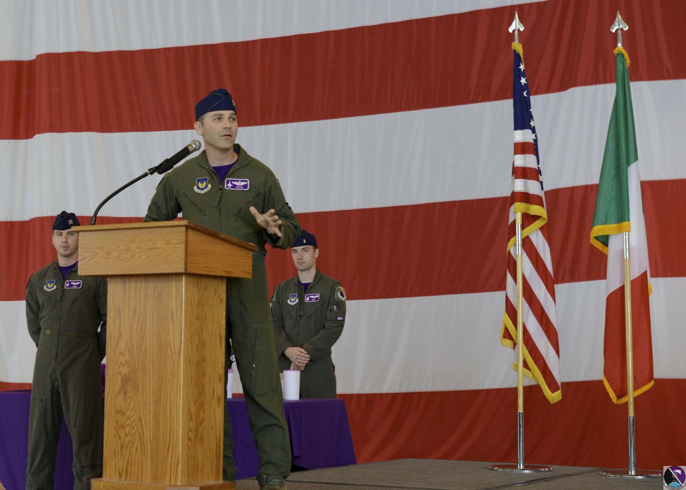 • U.S. Air Force Lt. Col. Daniel R. Lindsey, incoming commander of the 510th Fighter Squadron, speaks to an audience during a change of command ceremony at Aviano Air Base, Italy, June 21, 2019. Lindsey was previously Chief of Safety for the 31st Fighter Wing. (U.S. Air Force photo by Staff Sgt. Rebeccah Woodrow)