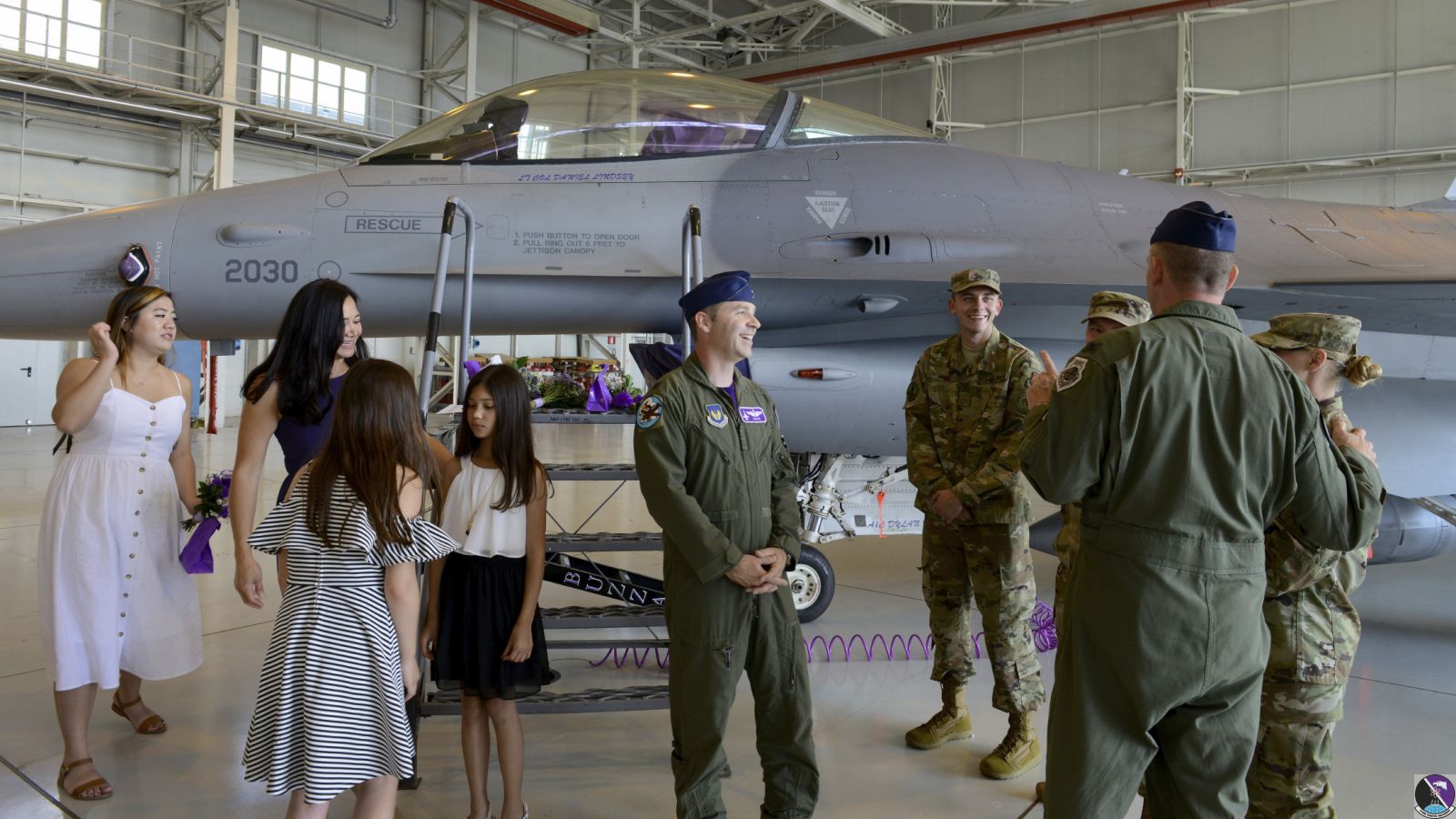 • Italian air force Col. Vincenzo Tozzi, Aviano base commander, greets friends and family after exiting an F-16 Fighting Falcon at Aviano Air Base, Italy, Sept. 17, 2019. Col. Tozzi was given a flight in an F-16 as a show of gratitude from the 31st Fighter Wing for his time as base commander. (U.S. Air Force photo by Staff Sgt. Kelsey Tucker)