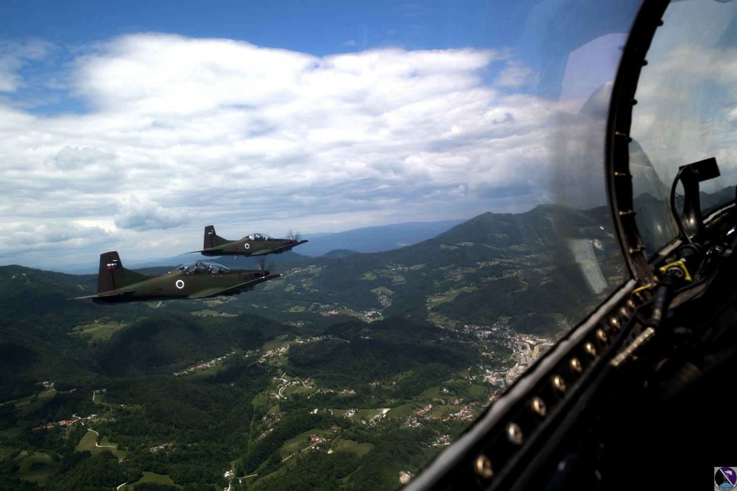 • Slovenian Pilatus PC-9s fly over Slovenia while training with 31st Fighter Wing aircraft, June 1, 2020. The 31st FW routinely trains with Slovenia increasing their interoperability and strengthening the NATO alliance. (U.S. Air Force photo by Senior Airman Caleb House)